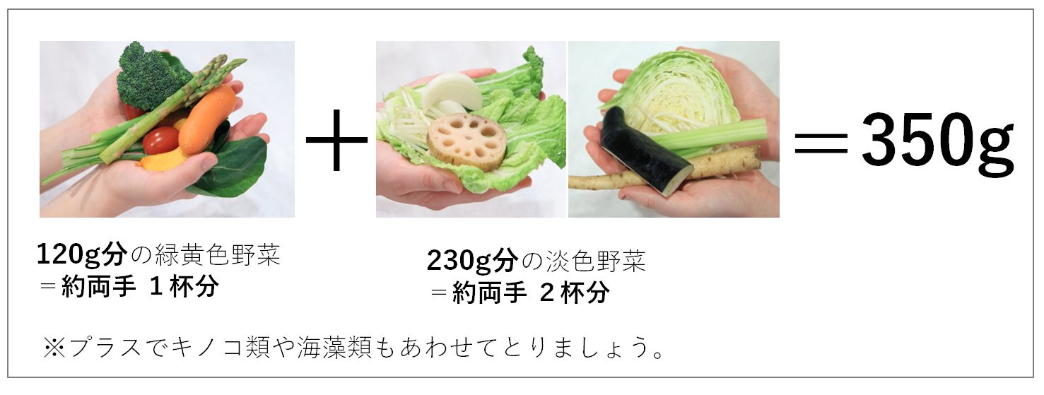 野菜の1日の摂取目安量は、緑黄色野菜120g+淡色野菜230g=350gです。