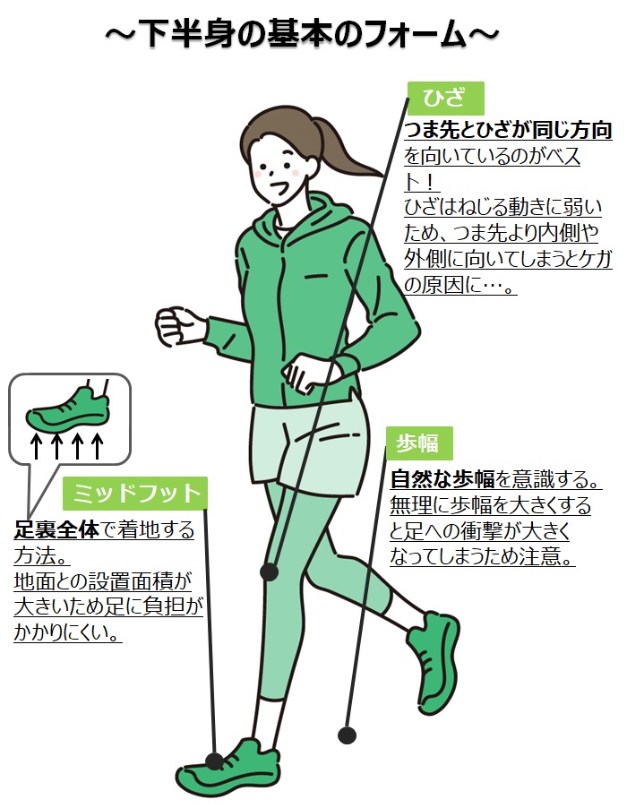 走る際に気を付けたいのがフォーム。フォームが崩れると必要以上に体に負担がかかりケガの原因に…。初心者の方は下記の図も参考に基本のフォームを意識してみましょう。