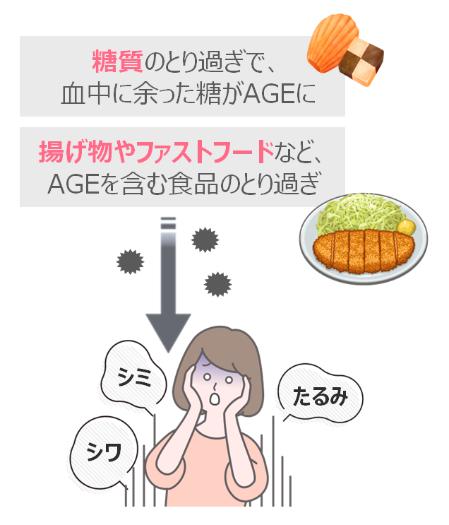 AGE(週末糖化産物):糖とたんぱく質が結合して加熱されるとできる物質。肌のコラーゲンやエラスチンがAGE化したり、AGEが肌に沈着することで、シワやたるみ、シミ、くすみなどが引き起こされます。