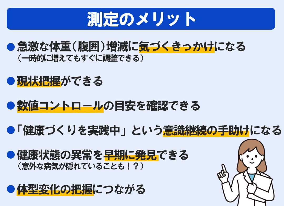 体重や腹囲の測定には、健康増進に役立つメリットがたくさんあります。