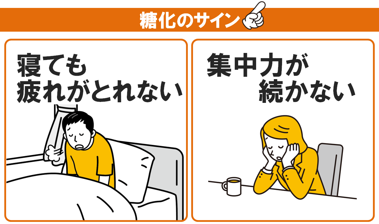 「寝ても疲れがとれない」「集中力がつづかない」等は、糖化のサインとして表れる症状の一種です。