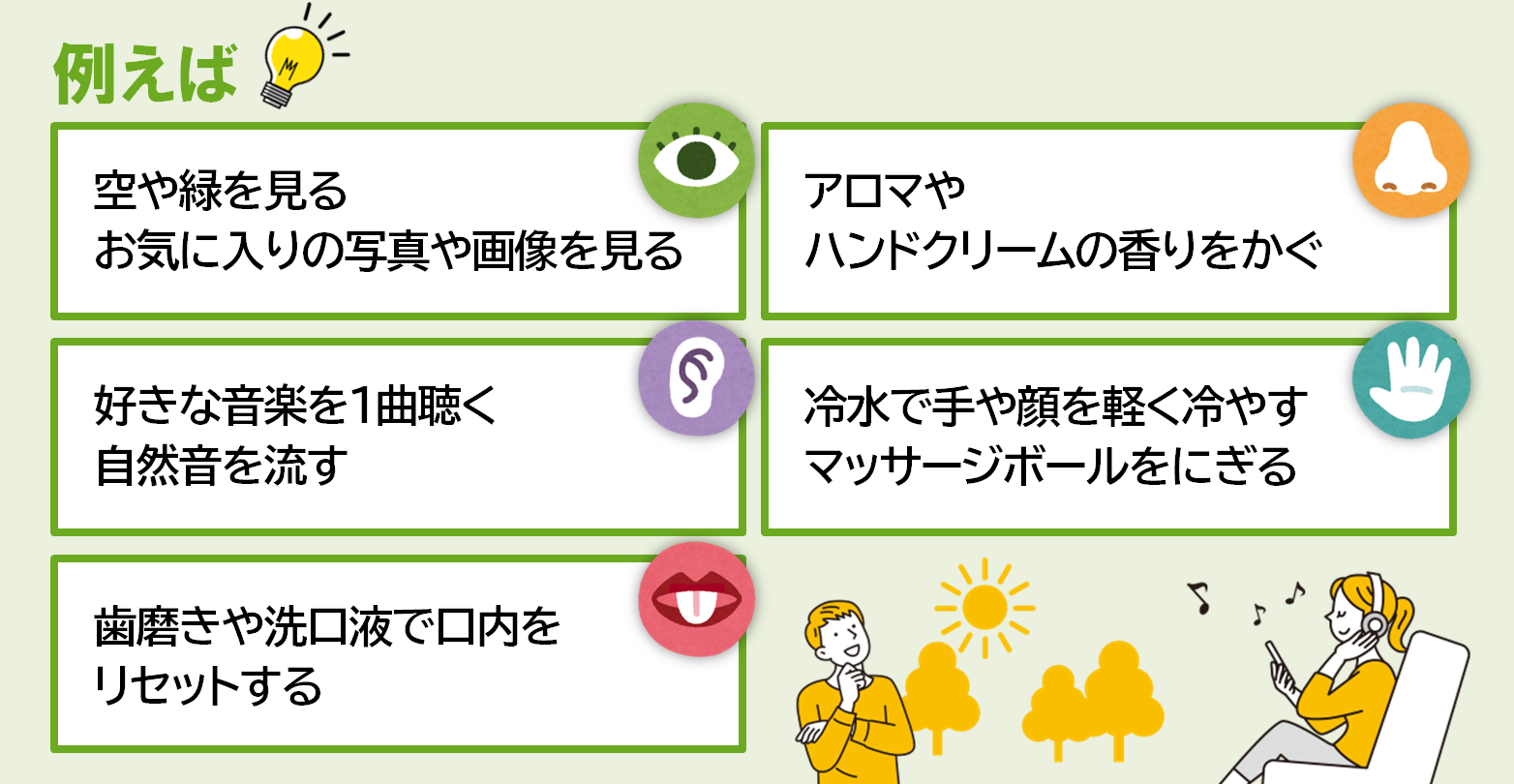 ここでは、「一時的な衝動」をコントロールするための気分転換法を、感覚・思考・感情の3タイプ別にご紹介します。