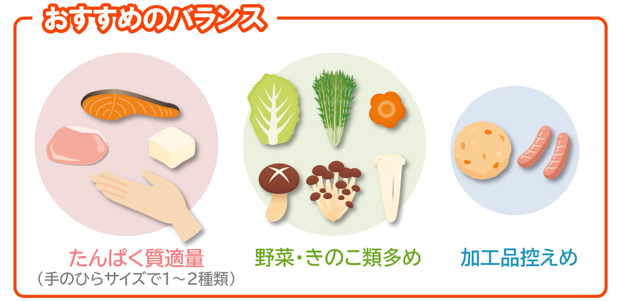 - 野菜・きのこ類は「鍋の半分以上」の量にする