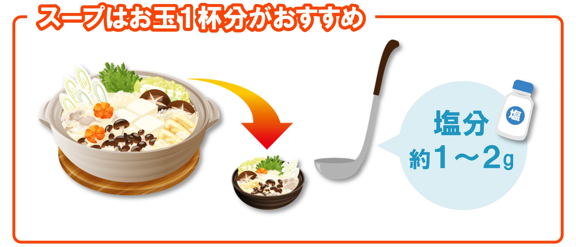 日本人は塩分をやや多めにとりがち。鍋のスープは調味料として楽しむ程度に、お玉1杯分だけ味わうようにすると安心。
