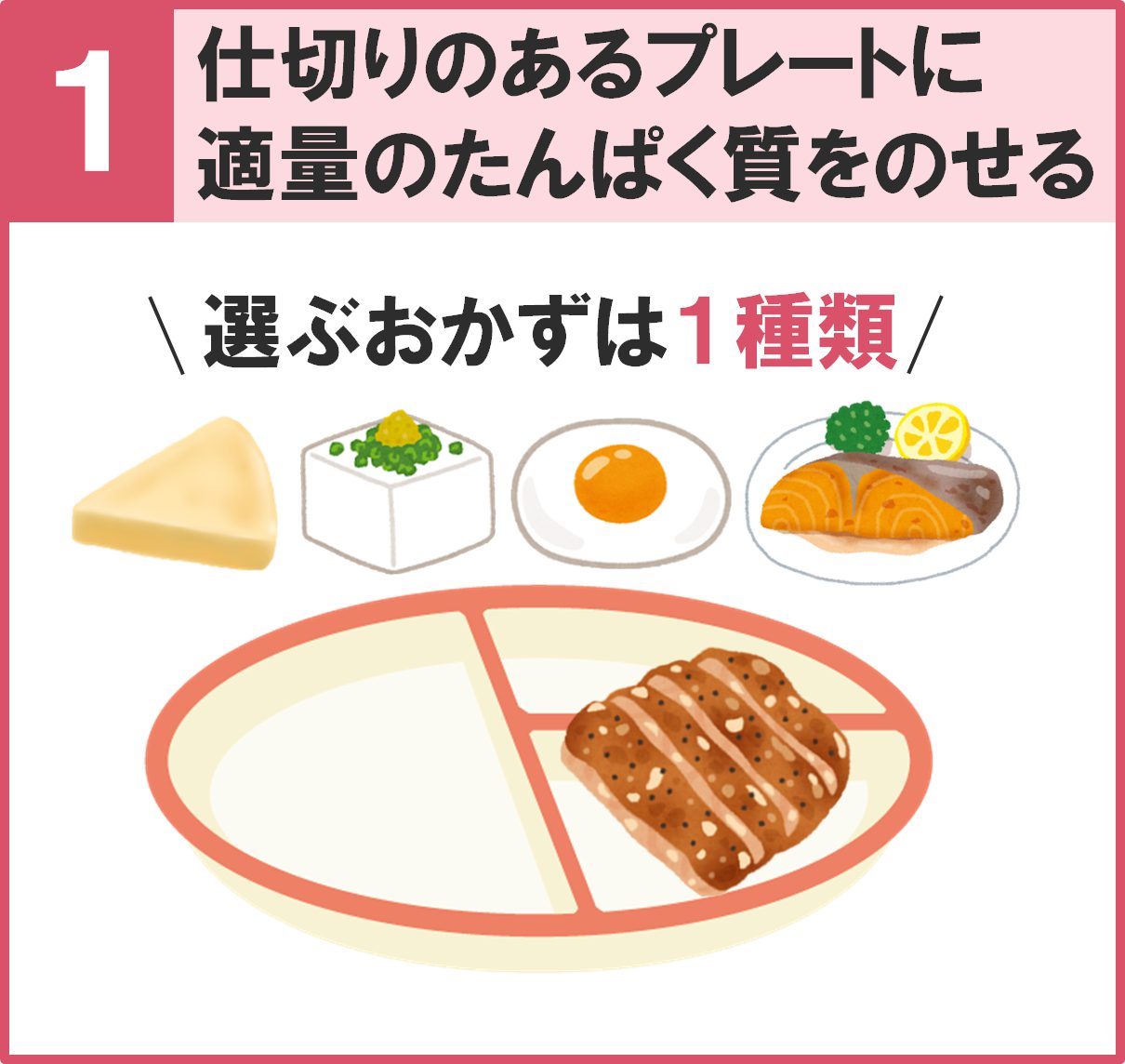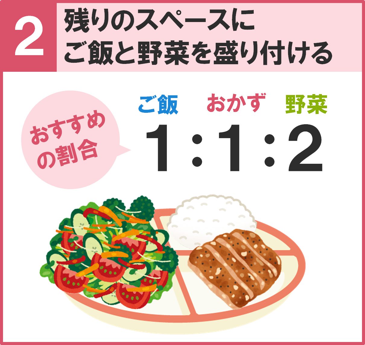 「適量プレート」を活用してご飯:たんぱく質のおかず:野菜=1:1:2の基本を覚えておくと、応用・習慣化しやすいですよ。