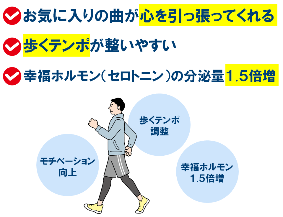 音楽と体の動きは相性バツグン。お気に入りの曲でウォーキングすれば、続けたくなるかも?