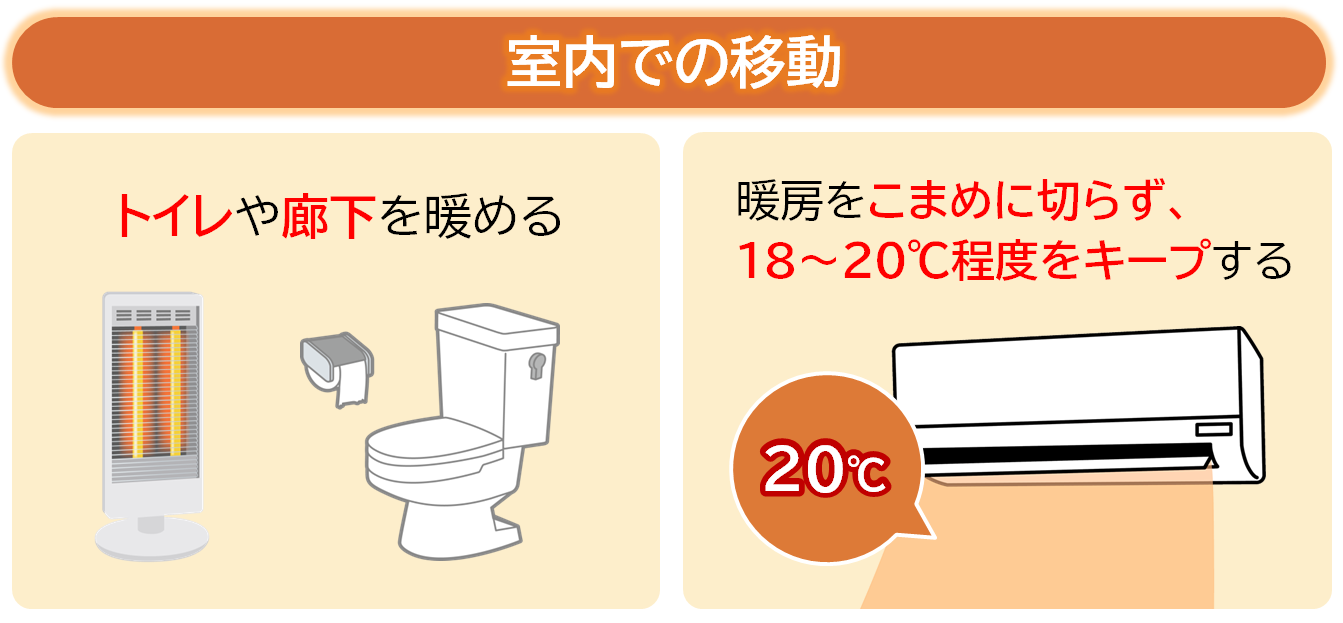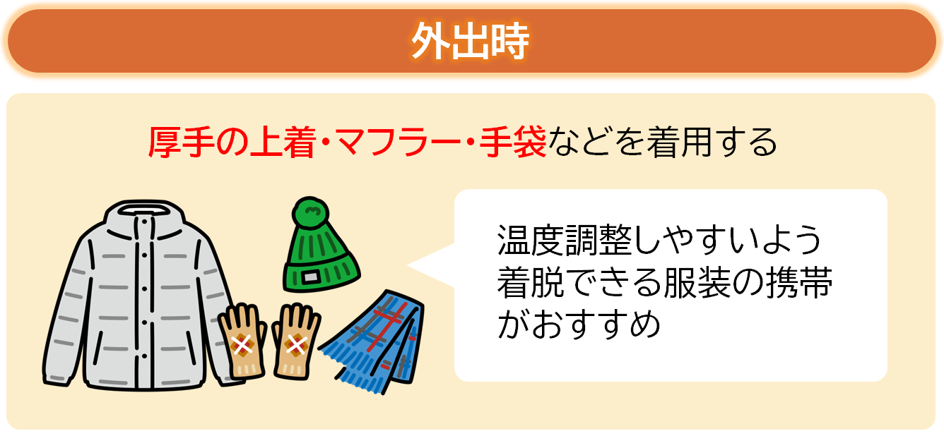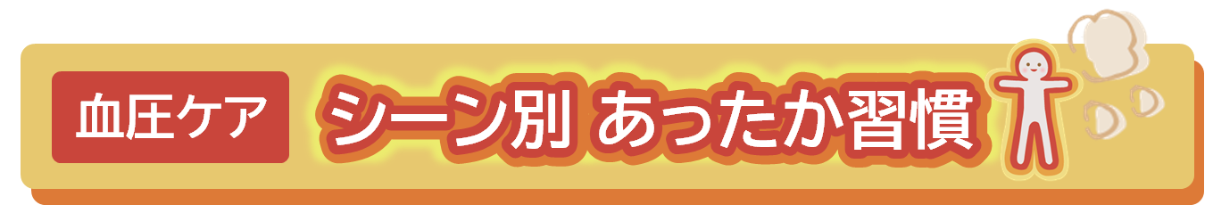 血圧が急上昇しやすいのは、暖かい場所から寒い場所へ移動する際(外出時・入浴時など)です。急激な温度変化への対策をとっておくと安心です。